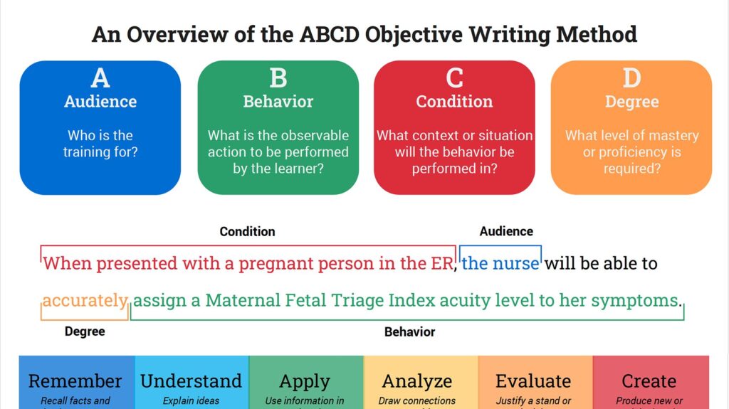 This infographic teaches the basics of ABCD objective writing and Bloom’s Taxonomy. It includes samples of learning objectives for each of the six levels.